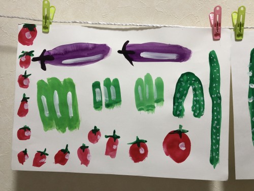 園の畑でとれた野菜を見ながら絵の具を使って描きました。(全員分は無かったので図鑑の絵なども活用)