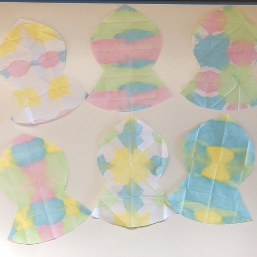 6月の壁面で子ども達と障子紙の染め物をしました◎5色の中からそれぞれ好きな色を決めて、自由につけてみんな違う柄に。目も自分で貼り可愛い製作になりました*\(^o^)/*