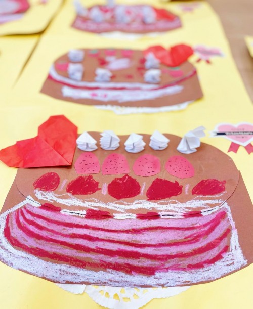 バレンタインの話をした後、子ども達にどんなチョコレートケーキを作って食べたい?と聞き、制作していきました。