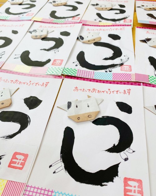 来年は丑年🐄で子ども達が『うし』という字を書いて牛の体に見立てました。