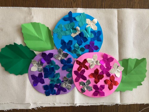 キラキラの折り紙を切り貼りしてあじさいを作りました!
