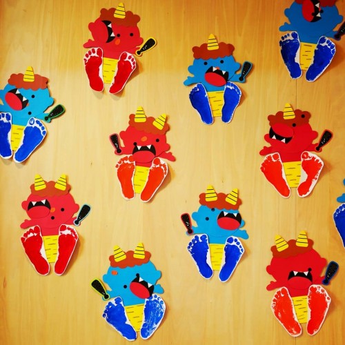 足形の節分製作です!顔は好きなところにパーツを貼って作ったのですかね。名前入りの金棒を持っているのがカワイイですね。