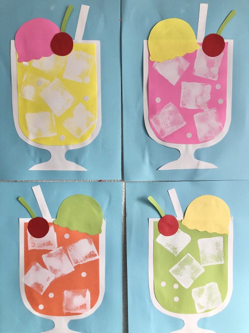 スポンジをスタンプとして使い、クリームソーダの氷にしました。